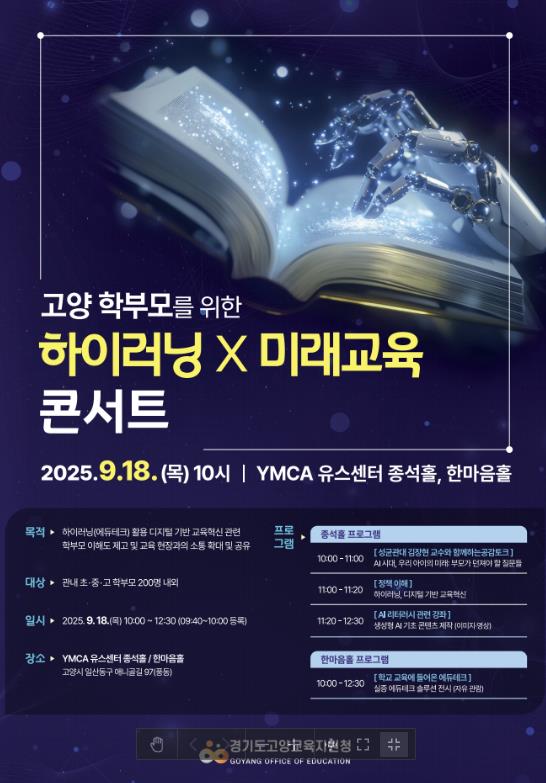 [무한뉴스=정승훈 기자] 경기도고양교육지원청은 9월 18일, 디지털 기반 교육혁신에 대한 학부모의 이해를 높이고 현장과의 소통을 강화하기 위해 '2025 고양 On 디지털 기반 교육혁신, 학부모 대상 하이러닝×미래교육 콘서트'를 YMCA 유스센터에서 성공적으로 개최했다. 관내 초·중·고 학부모 약 150명이 참석하여 하이러닝과 에듀테크 활용 교육에 대한 높은 관심을 보였다.