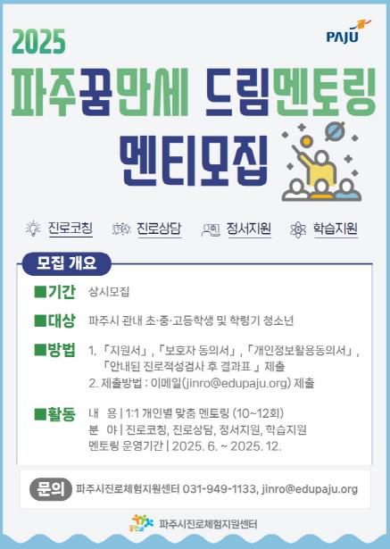 [무한뉴스=정승훈 기자] 파주시는 관내 청소년의 진로 설계지원을 위한 ‘2025 파주꿈만세 드림멘토링’ 사업을 본격적으로 시작한다.