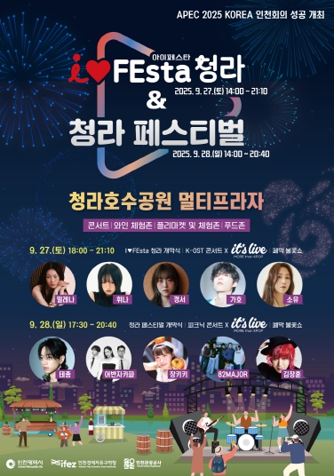 [무한뉴스=정승훈 기자] 인천경제자유구역청이 주최하고 인천관광공사(사장 백현)가 주관하는‘2025 I♥FEsta 청라 & 청라 페스티벌’이 9월 27일과 27일 이틀간 청라 호수공원 멀티프라자에서 열린다.