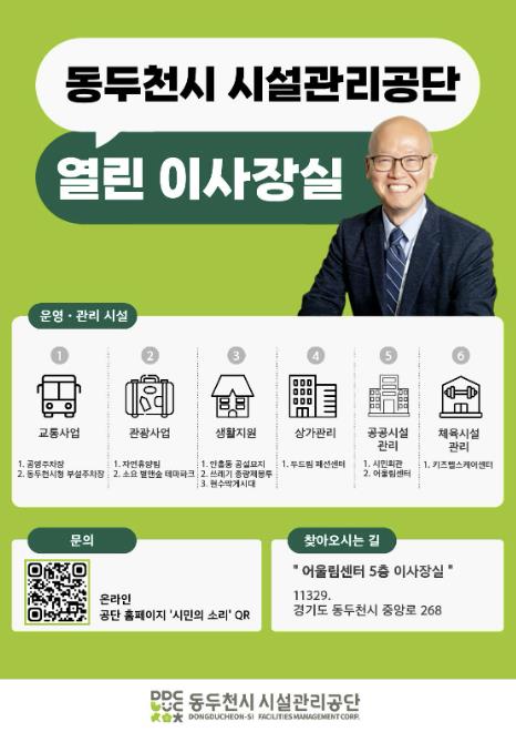 [무한뉴스=정승훈 기자] 동두천시 시설관리공단은 시민과의 소통을 강화하고 현장의 목소리를 경영에 적극 반영하기 위해 10월부터 ‘열린 이사장실’을 연중 상시 운영한다고 밝혔다.