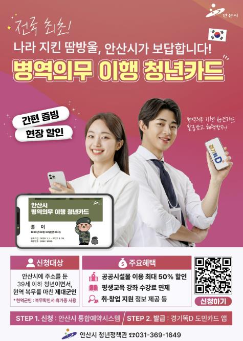 청년카드 발급 대상은 안산시에 주민등록이 되어있는 39세 이하 청년 가운데 현역 복무를 마친 의무·중기·장기 복무 제대군인이다. 신청은 ‘안산시통합예약시스템’을 통해 온라인으로 간편하게 접수할 수 있다. 현역 복무 중인 경우, 복무확인서 또는 휴가증을 사용해 동일한 혜택을 받을 수 있다.