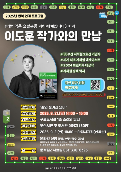 행사는 ‘이번 역은 요절복통 지하세계입니다’의 저자이자 부산 도시철도 2호선 기관사로 근무 중인 이도훈 작가를 초청해 진행한다. 이 작가는 ‘삶의 숨겨진 묘미’에 대해 이야기하고, 참가자들에게 기상천외한 지하세계의 다채로운 풍경을 전달할 예정이다.