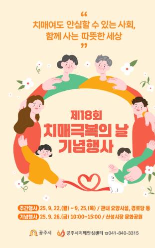 이어 26일 산성시장에서 열리는 기념행사에서는 ▲치매 인식 개선 캠페인 ▲치매 퀴즈(OX) ▲치매·우울감 선별검사 ▲공주시 보건소 주요 사업 홍보 등 시민이 직접 참여할 수 있는 프로그램이 마련돼 치매에 대한 관심을 높이는 계기가 될 것으로 기대된다.