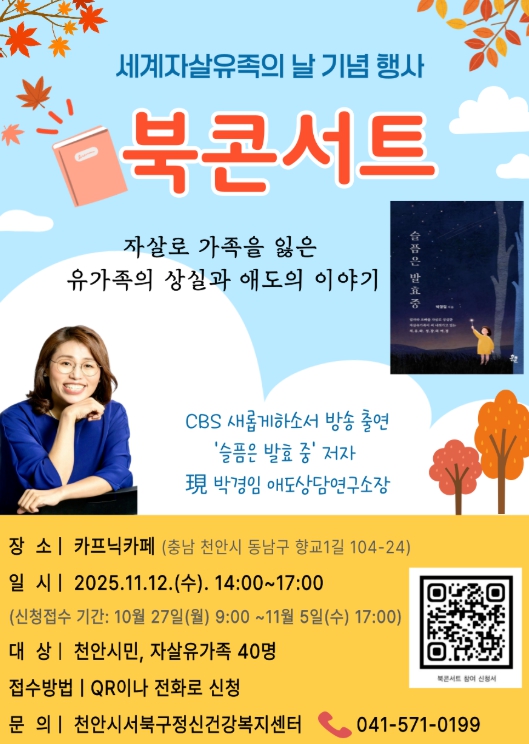 북콘서트에는 천안시민과 자살유가족 누구나 참여할 수 있으며, 내달 5일까지 홍보문 내 정보무늬(QR코드) 혹은 전화로 신청하면 된다.