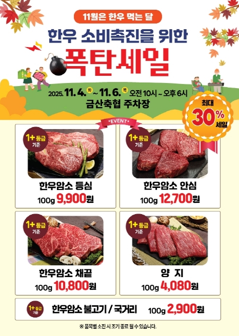 [무한뉴스=정민정 기자] 한우 농가의 경영 안정을 위한 폭탄세일 행사가 11월 4일부터 11월 6일까지 금산축협 주차장에서 열린다.