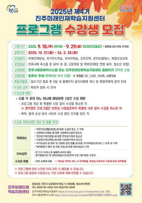 [무한뉴스=최진수 기자] 진주미래인재학습지원센터는 9월 18일부터 29일까지‘2025년 제4기 프로그램’ 수강생을 진주시통합예약시스템과 미래인재센터 누리집을 통해 모집한다.