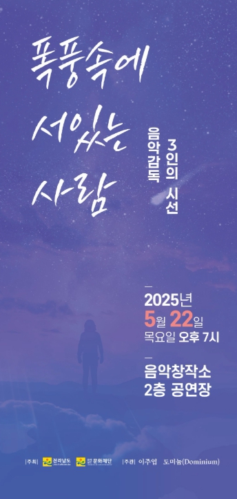 [무한뉴스=정민정 기자] 전라남도 음악창작의 요람, 강진군 전남음악창작소에서 지역을 대표하는 작곡가 이주엽의 특별한 음악 프로젝트 『폭풍 속에 서 있는 사람 – 작곡가 3인의 시선』이 오는 5월 22일 목요일 오후 7시, 전남음악창작소 2층 공연장의 문을 활짝 연다.
