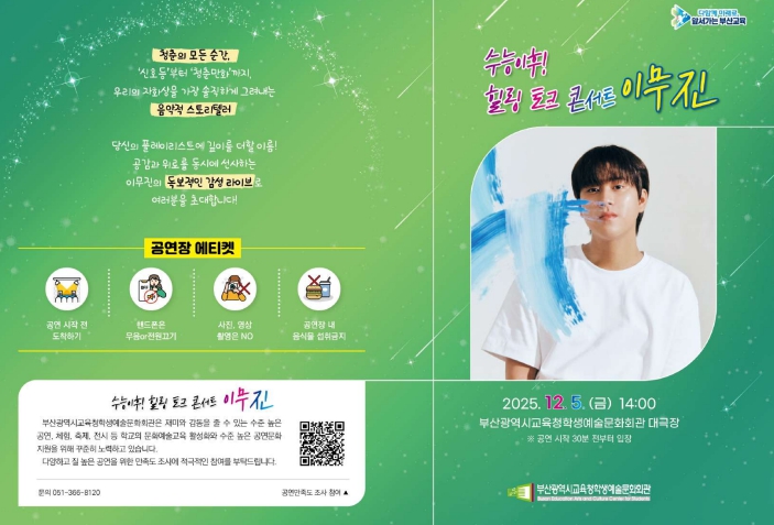 [무한뉴스=최진수 기자] 부산광역시교육청학생예술문화회관(관장 박은혜)은 오는 5일 오후 2시 학생예술문화회관 대극장에서 수능을 마친 고3 학생 700여 명을 대상으로 가수 이무진과 함께하는 ‘수능 이후! 힐링 토크 콘서트’를 개최한다.