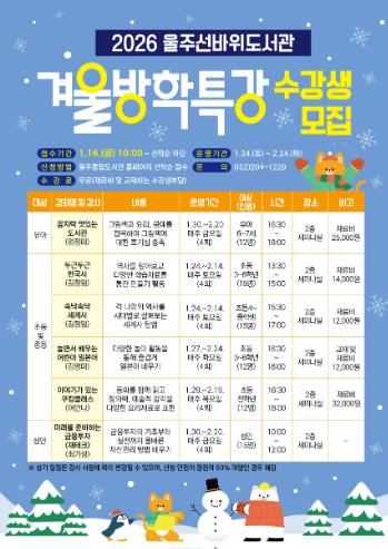 [무한뉴스=최진수 기자] 울주선바위도서관이 겨울방학을 맞아 오는 24일부터 겨울방학특강을 운영한다고 15일 밝혔다.