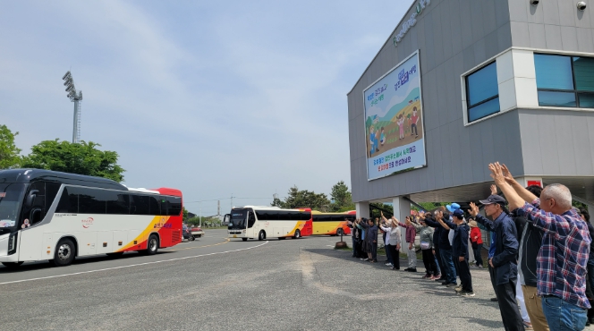 | ▲ 학생푸소 체험을 마치고, 푸소 운영 농가들이 돌아가는 학생들에게 인사를 하고 있다. |