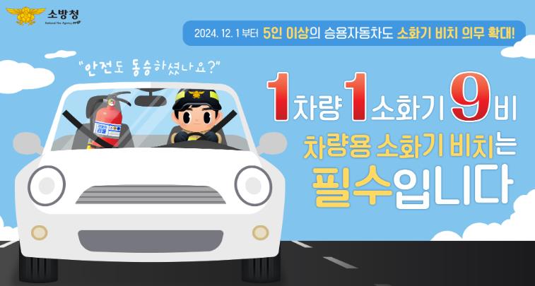 소방서는 승합차, 1톤 이상 화물차, 특수차, 어린이통학버스 등 일정 규모 이상의 차량은 차량용 소화기를 의무적으로 비치해야 하며, 이외의 차량도 자발적으로 비치할 것을 권장하고 있다.