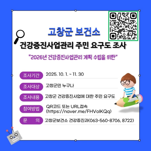 [무한뉴스=정민정 기자] 고창군보건소가 통합건강증진사업 주민요구도 조사를 11월30일까지 실시하고 있다.