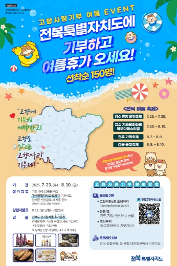 [무한뉴스=정민정 기자] 전북특별자치도는 고향사랑기부제를 널리 알리고 도외 관광객의 참여를 유도하기 위해 오는 8월 10일까지 ‘고향사랑기부 여름 이벤트’를 진행한다고 밝혔다.