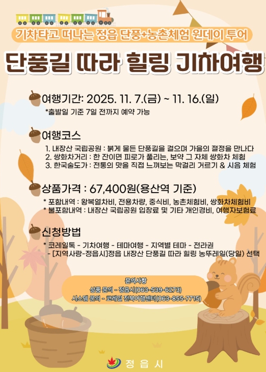 [무한뉴스=정민정 기자] 가을 여행 성수기를 맞아 정읍시가 내장산 단풍과 농촌체험을 결합한 특별 기차여행 상품 ‘농뚜레일 투어’를 선보인다.