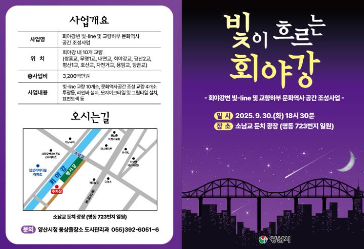 [무한뉴스=최진수 기자] 양산시 웅상출장소는 ‘회야강 르네상스’비전의 일환으로 추진한 ‘회야강변 빛-Line 및 교량하부 문화역사공간 조성사업’을 완료하고, 오는 9월 30일 소남교 둔치 광장에서 점등식을 개최한다고 밝혔다.