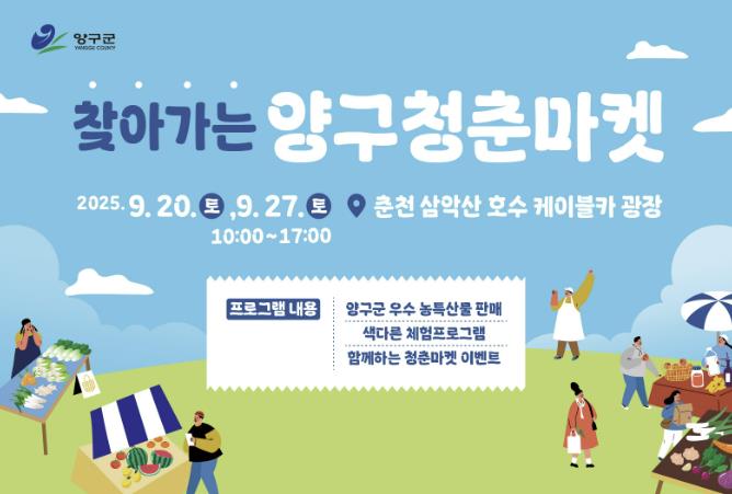 [무한뉴스=정민정 기자] 양구군은 지역 농가의 안정적인 판로 확보와 소득 증대를 위해 ‘2025 찾아가는 양구 청춘마켓’을 오는 9월 20일과 27일, 양일간 춘천시 삼악산 호수 케이블카 광장에서 운영한다.