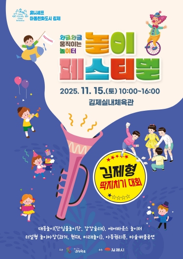 [무한뉴스=정민정 기자] 김제시는 아이들이 자유롭게 놀며 성장하는 아동친화도시 실현을 위해 오는 15일, 김제실내체육관 및 주차장 일대에서 와글와글 움직이는 놀이터,‘제2회 놀이페스티벌’행사를 개최한다고 밝혔다.