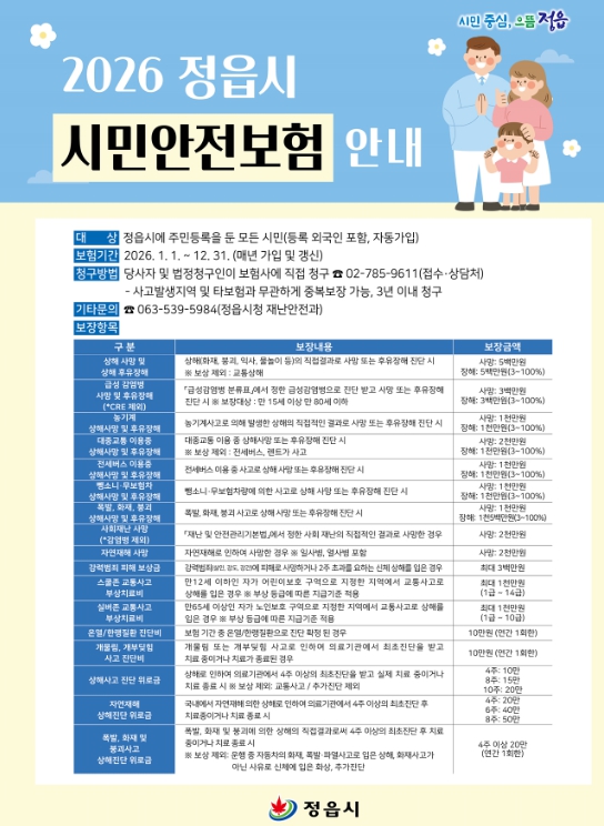 [무한뉴스=정민정 기자] 정읍시가 각종 재난과 일상 속 사고로부터 시민들을 보호하기 위해 2026년 시민안전보험의 보장 범위를 대폭 강화했다.