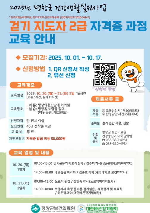 [무한뉴스=정민정 기자] 평창군보건의료원은 군민의 건강한 걷기 문화를 확산하기 위해 오는 10월 20일부터 21일까지 2일간 ‘걷기 지도자 2급 자격증 과정’ 교육을 운영한다.