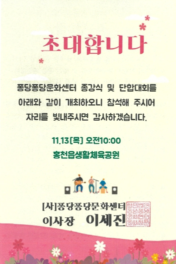 [무한뉴스=정민정 기자] 홍천군은 11월 13일, 홍천읍 생활체육공원에서 '제4회 퐁당퐁당 문화센터 종강식 및 단합대회'를 개최한다고 밝혔다.