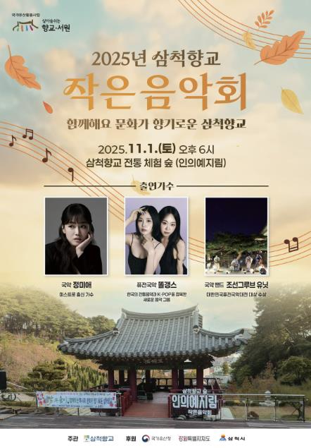 이번 행사는 국가유산청 향교·서원 국가유산 활용사업으로 추진되는 ‘함께해요 문화가 향기로운 삼척향교’ 사업의 일환으로, 시민들에게 전통문화유산 속에서 음악으로 힐링하는 시간을 제공하기 위해 마련됐다.