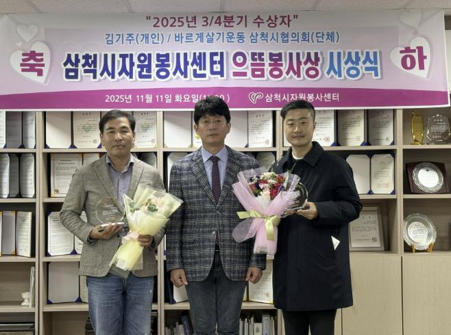 [무한뉴스=정민정 기자] 삼척시자원봉사센터는 11월 11일 자원봉사센터 회의실에서 ‘2025년 3분기 으뜸봉사상 시상식’을 열고, 지역사회 나눔과 봉사활동에 앞장선 우수 봉사자와 단체를 선정했다.