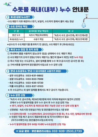 [무한뉴스=정민정 기자] 속초시가 ‘수돗물 누수 안내문’을 제작·배포하며 생활 속 물 절약 실천 확산에 나섰다.