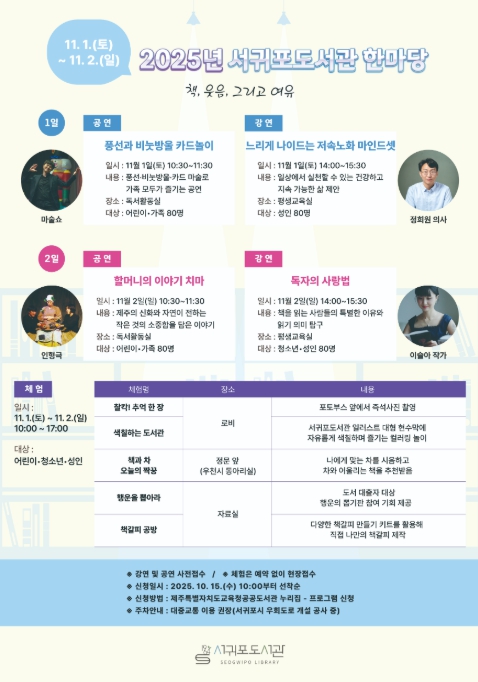 [무한뉴스=정민정 기자] 제주도교육청 서귀포도서관은 11월 1일과 2일 양일간 지역 주민이 함께 즐기는 독서문화 축제 ‘2025년 서귀포도서관 한마당’을 개최한다.