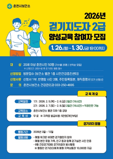 [무한뉴스=정민정 기자] 춘천시보건소가 시민의 걷기 실천 역량을 높이고 지역사회 중심의 걷기문화를 확산하기 위해 ‘2026년 걷기지도자 2급 양성 교육’ 참여자를 모집한다.