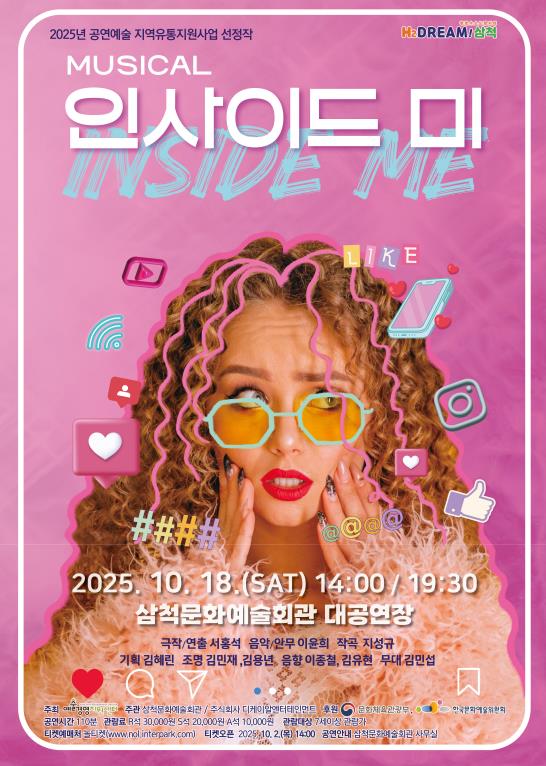 [무한뉴스=정민정 기자] 삼척시는 2025년 공연예술 유통지원사업의 일환으로 뮤지컬 인사이드 미를 오는 10월 18일 삼척문화예술회관 대공연장에서 선보인다.