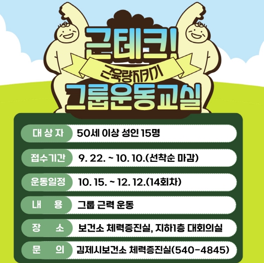 프로그램은 오는 10월부터 12월까지 총 3개월간 주 1~2회, 총 14회에 걸쳐 운영되며, 만 50세 이상 성인 15명을 대상으로 김제시보건소 체력증진실 등에서 진행될 예정이다.