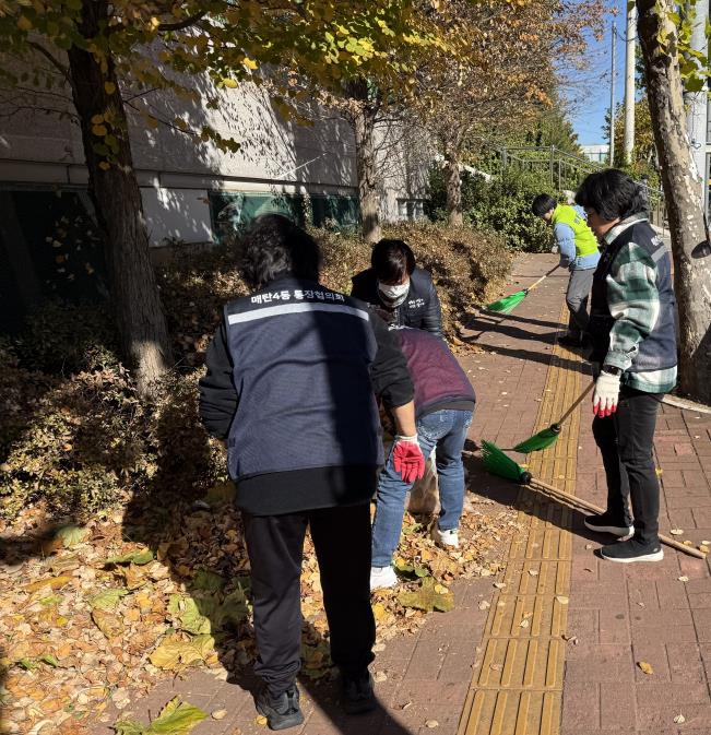 이번 대청소에는 매탄4동 직원과 통장협의회 등 30여 명이 함께 참여해, 통행량이 많고 낙엽이 많이 쌓이는 매탄공원 인근 대로변 및 골목길 일대를 중점적으로 청소하였다.