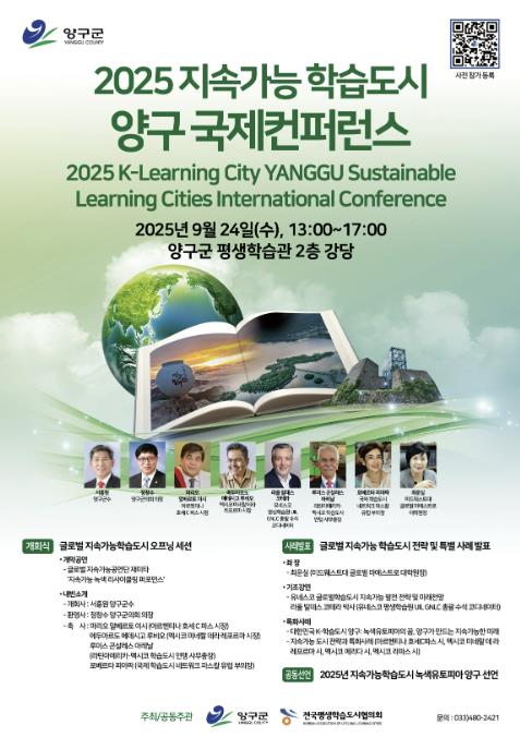 글로벌 지속가능 학습도시 동향과 미래 전망을 다루는 기조연설을 시작으로 △K-학습도시 양구군 특화 사례 △라틴아메리카 및 멕시코 학습도시연맹 도시들의 전략과 특별사례 발표가 이어진다. 마지막으로 ‘지속가능 학습도시 녹색 유토피아 양구 공동선언’을 통해 학습 도시 간 협력 비전을 공유할 예정이다.