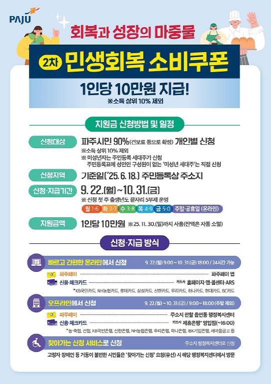 [무한뉴스=정승훈 기자] 파주시는 소비 활성화 및 자영업자 매출 확대를 통한 민생경제 회복을 위해 정부가 추진하는 ‘민생회복 소비쿠폰’ 2차 지급을 오는 22일부터 10월 31일까지 실시한다고 밝혔다.