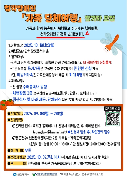 [무한뉴스=정승훈 기자] 인천시사회서비스원 소속 인천장애인종합복지관은 청각장애인 가족 단체여행 참가자를 모집한다고 17일 밝혔다.