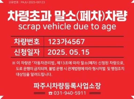 [무한뉴스=정승훈 기자] 파주시는 6월 16일부터 환가가치가 없는 차량에 한해 ‘차령초과 말소차량 식별 스티커 부착 시범사업’을 본격 시행한다.
