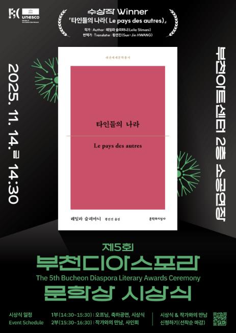 [무한뉴스=정승훈 기자] 부천시는 11월 14일 부천아트센터에서 열리는 ‘2025년 제5회 부천디아스포라문학상’ 시상식을 앞두고, 수상작으로 레일라 슬리마니 작가의 ‘타인들의 나라(Le pays des autres)’를 선정했다고 22일 밝혔다.