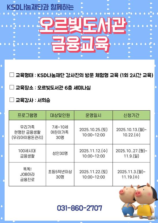[무한뉴스=정승훈 기자] 동두천시 도서문화사업소는 KSD나눔재단과 함께 10월 25일부터 11월 22일까지 오르빛도서관 6층 세미나실에서 세대별 맞춤형 금융교육 프로그램을 운영한다.