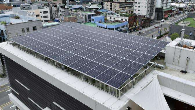 | ▲ 호계1동 행정복지센터 옥상에 설치한 태양광 패널 사진 |