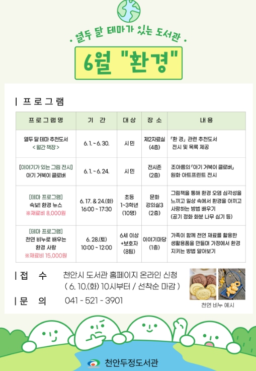 접수는 오는 6월 10일 천안시도서관 누리집에서 가능하며, 문의사항은 두정도서관으로 하면 된다.