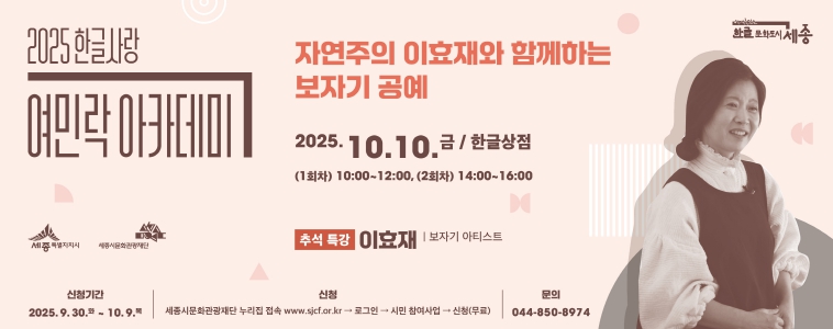 [무한뉴스=정민정 기자] 세종시문화관광재단(대표이사 박영국)은 ‘2025 한글사랑 여민락 아카데미 추석 특별강좌’를 오는 10월 10일 진행한다.