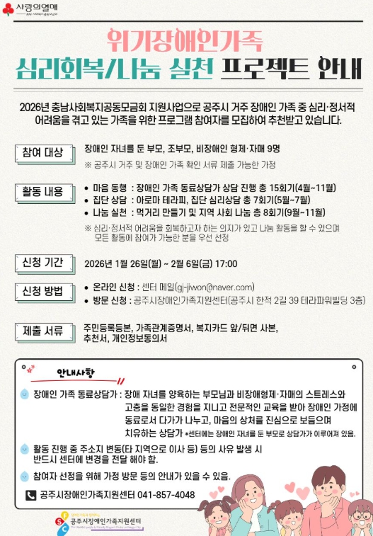 [무한뉴스=정민정 기자] 공주시 장애인가족지원센터는 2026년 충남사회복지공동모금회 지원을 받아 ‘위기 장애인가족 심리회복 및 나눔 실천 프로젝트’ 참여자를 모집한다고 26일 밝혔다.