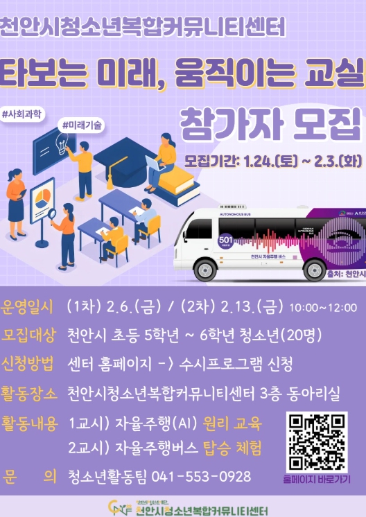 [무한뉴스=정민정 기자] (재)천안시청소년재단 천안시청소년복합커뮤니티센터가 겨울방학을 맞아 자율주행버스를 직접 타보고 미래 기술을 배우는 ‘타보는 미래, 움직이는 교실’ 참가자를 모집한다고 26일 밝혔다.