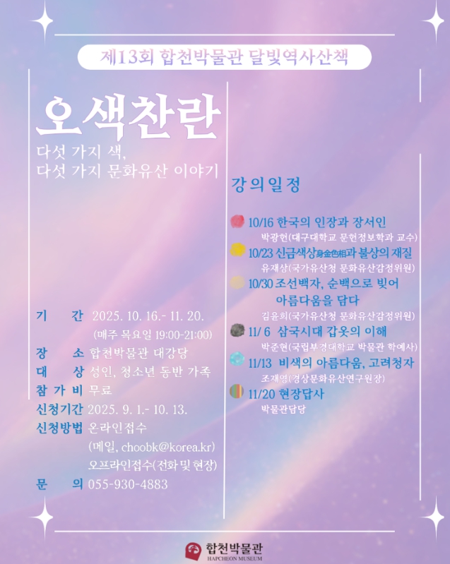 달빛역사산책은 2013년부터 이어져 온 합천박물관의 대표적인 야간 역사문화 강좌로, 지역민들에게 꾸준한 사랑을 받아온 프로그램이다. 올해는 ‘오색찬란 – 다섯 가지 색, 다섯 가지 문화유산 이야기’를 주제로 한국 문화유산 속 다섯 가지 색을 중심으로 역사․미술․고고학 분야 전문가들이 강연을 펼치며, 색을 매개로 문화유산의 의미를 새롭게 조명한다.