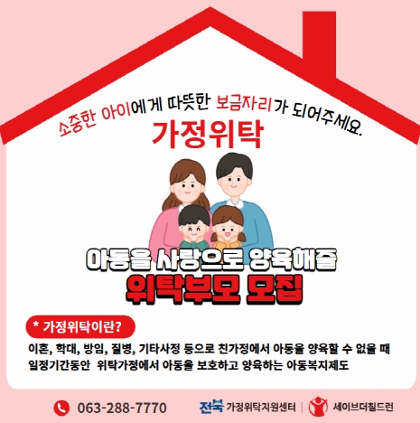 김정 전북자치도 여성가족과장은 “가정위탁은 아이에게 또 다른 가족을 만들어주는 소중한 제도”라며 “보다 많은 도민이 가정위탁에 관심을 갖고 따뜻한 손길을 내밀어주시길 기대한다”고 말했다.