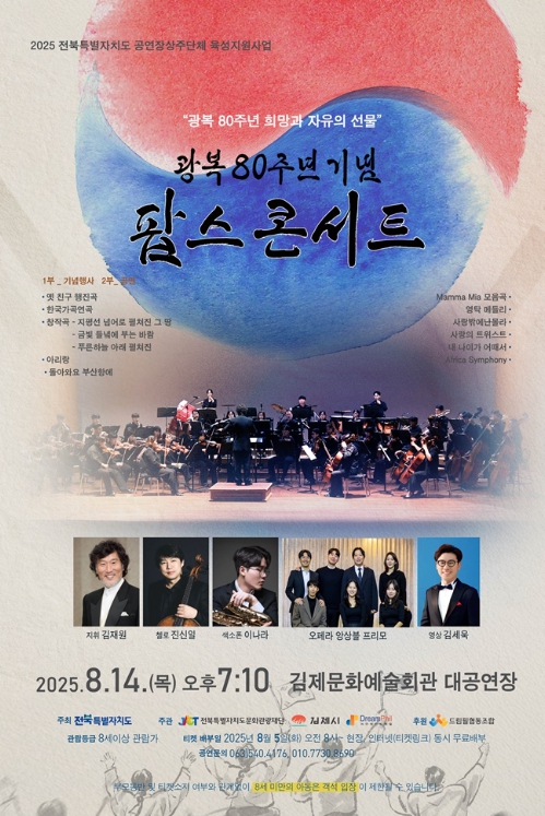 [무한뉴스=정민정 기자] 광복 80주년을 맞아, 특별한 음악회로 시민과 함께하는 '광복 80주년 기념 팝스 콘서트'가 오는 8월 14일 오후 7시 10분 김제문화예술회관 대공연장에서 펼쳐진다.