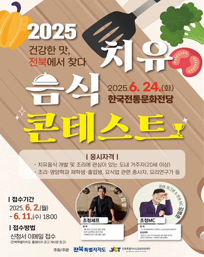 이번 콘테스트는 전북도에 거주하는 조리·영양학과 대학생이나 전공자, 요식업 종사자 등 치유음식에 관심이 있는 도민이라면 누구든 지원 가능하다.