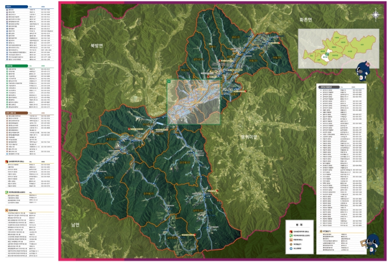 지도에는 홍천읍 행정리 경계를 중심으로 관공서와 교육시설, 재난 대피시설, 마을회관, 경로당, 무인민원발급기 위치 등 마을별로 필요한 주요 행정정보를 함께 표시해 주민 활용도를 높였다.
