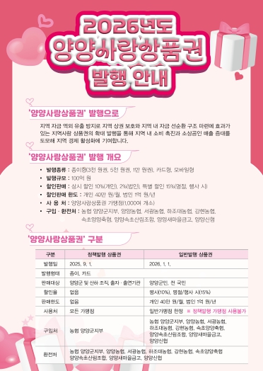 군 관계자는 “양양사랑상품권 종이·카드형 병행 발행으로 군민과 관광객 모두가 보다 폭넓게 상품권을 활용할 수 있을 것”이라며 “앞으로도 가맹점 확대와 다양한 이용처 발굴을 통해 지역경제 활성화에 실질적인 도움이 되도록 하겠다”고 말했다.