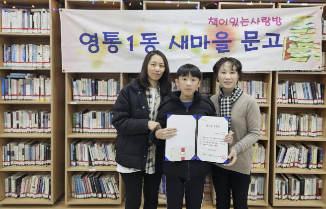 신한길 영통1동장은 “다독부문과 도서관 다출석 부문을 수상하신 모든 분들께 진심으로 축하드린다”며 “앞으로도 새마을문고 활성화를 위해 적극 지원하겠다”고 전했다.